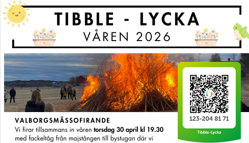 Tibble-Lycka Bladet – våren 2026 31 mars, 2026 av Tibble-Lycka Tibble-Lycka Bladet för våren 2026.Med bland annat:– Valborgsmässofirande– Grannsamverkansmöte 15 april– Städdag 19 april m.m.Läs bladet här >>(pdf) Dela det här: Dela på X (Öppnas i ett nytt fönster) X Dela på Facebook (Öppnas i ett nytt fönster) Facebook Relaterade